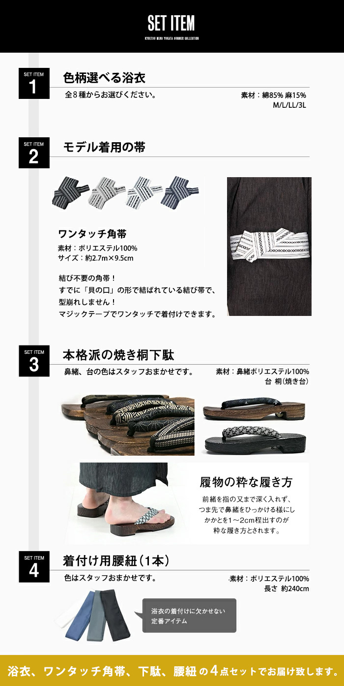 モデル着用のコーディネート通りの[浴衣]+[帯]+[下駄]+[腰紐]の4点セットをお届けします!